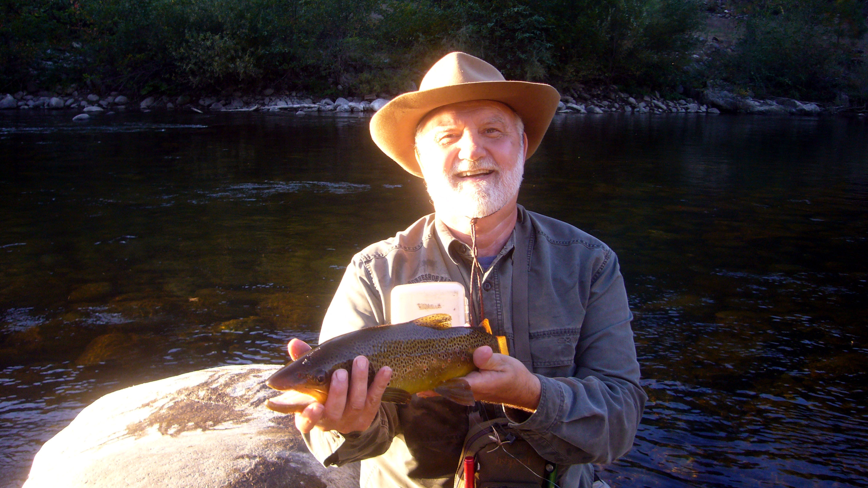 After a few casts upstream I decided to let the flies float into the far riffle which was about 12” to 18” deep, You can see the area in the river pic attached. It’s the lower white water area. As the flies entered the riffle I was expect a hit because it seemed like a good feeding area. On the third cast BANG!!! This large brown came up and really smacked the Tarantula. I knew I had him as there was no doubt that he grabbed that fly hard and it was buried deep into his tongue. He was strong, but I had plenty of room to play him. I tried a trick Bill Carnazzo had suggested which was to lower the rod to the water perpendicularly and start reeling. The fish came out of the fast water quite easily and I now had control of him. I waived the guys up at the lower Gray Eagle pool to come down as I wanted a pic. As they arrived the fish had tired and I was able to land him. The colors were beautiful. Pictures rarely do justice to a beautiful fish and the attached pic shared this trait. This fish made my day.